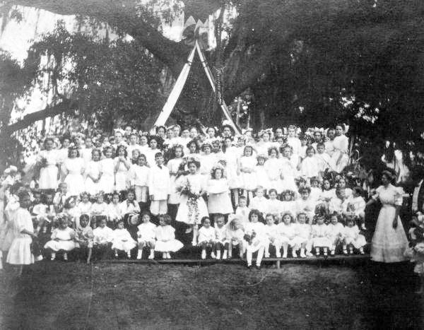 Annie Houston Sensabaugh is pictured 11th from the left on the front row in this 1910 May Day photo, taken at "the May Oak" at Lewis Park on East Park Avenue (now alas, only a stump). Photo from Florida State Archives.